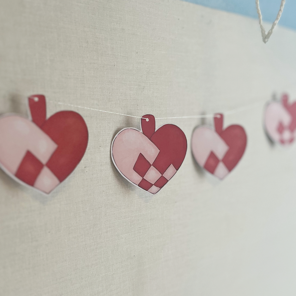 Smuk vimpel med julehjerter – digitalt tegnet, printet og præcist skåret på maskine. En moderne og enkel juledekoration, perfekt til vinduet, væggen eller julebordet.